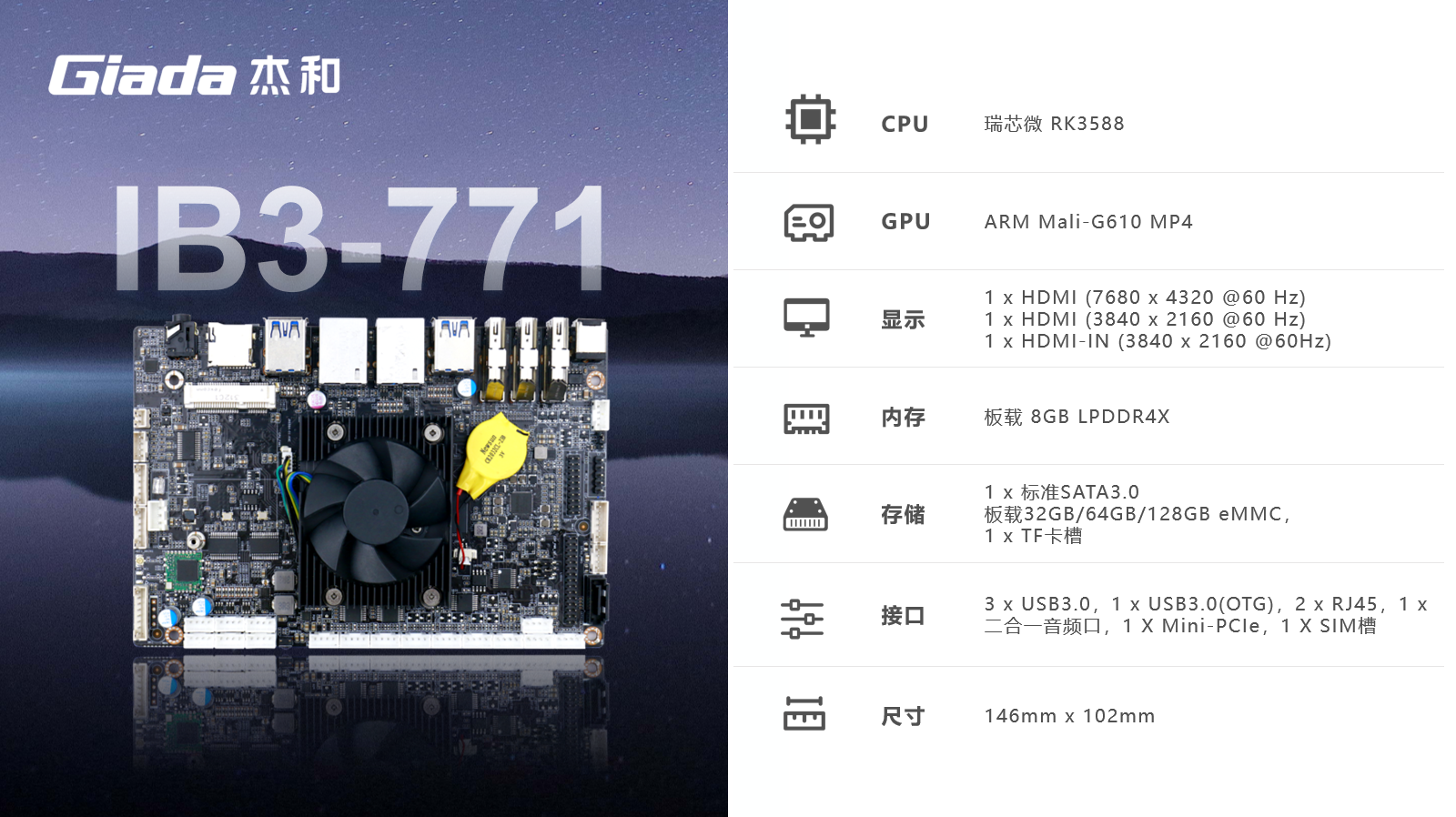 好博(中国)体育ARM主板IB3-771采用瑞芯微RK3588(4*A76+4*A55@2.4GHz)八核64位处理器,集成ARMMali-G610 MC4 GPU,内置AI加速NPU,提供6TOPs算力,板载8GB LPDDR4X内存,支持8K@60fpsH.265/VP9视频解码和8K@30fps H.264视频编码,进行图像及视频的高效采集和处理,可广泛应用于交互式智慧显示屏、智慧显示一体机、智能自助终端等场景。