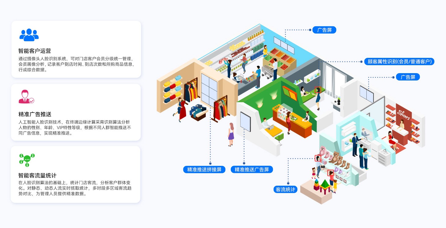好博(中国)体育GDSM-ES智能零售管理系统还可实现宣传推广内容的精准推送,高效触达。系统融合人工智能技术,采用专业的人脸识别算法,通过终端接入摄像设备与AIOT设备,自动识别不同的物体、动作和行为,形成人物画像,为广告屏幕的内容推送提供数据支持,实现精准营销。同时还可以提供客流统计和客群分析功能,为零售客户提供精准的门店数字化运营管理方案。