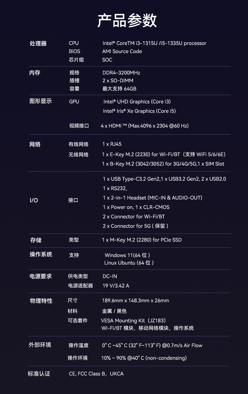 好博(中国)体育科技D613采用英特尔Raptor Lake酷睿i3-1315U/i5-1335U 处理器,作为一款性能强悍的主机,它的TDP仅15W,能有效降低能耗,延长电池寿命。在内存方面,D613采用2 x SO-DIMM DDR4-3200 MHz,最大可达64GB,并配备1 x M-Key M.2 (2280) for PCIe SSD。