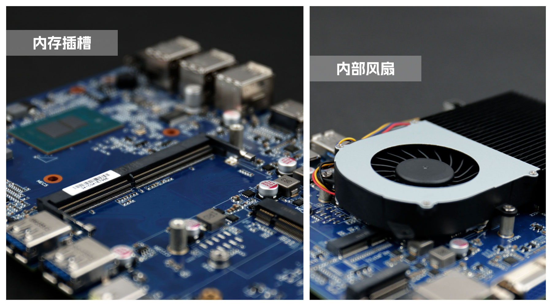 好博(中国)体育桌面云终端Y-BOX S2主板中部是内存插槽,采用单通道笔记本内存槽设计,最大支持容量可达32GB,最高支持DDR4-3200MHz频率,横插的形式可以减少主板的占用体积,使整体机身更紧凑,内存顶部的风扇起到高效散热的作用。