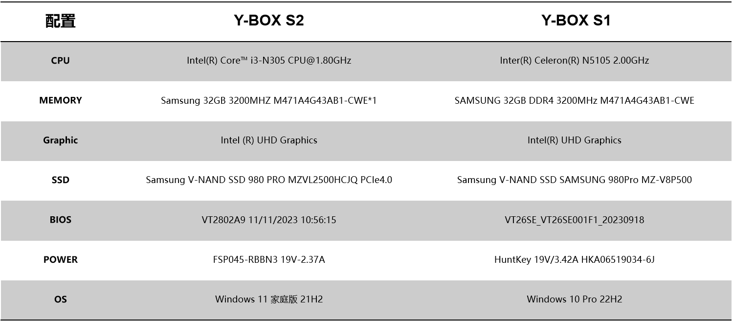 针对桌面云终端Y-BOX S2的测试项目中,最值得关注的是性能测试的跑分数据和稳定性测试内容,这能直观影响主机在使用过程中的稳定性和用户的使用体验。针对性能测试,好博体育选择了将Y-BOX S2与前一款更迭产品Y-BOX S1进行对比分析,Y-BOX S2支持Intel® Alder lake-N处理器,Y-BOX S1支持Intel® Jasper Lake,并分别选取了以下配置:
