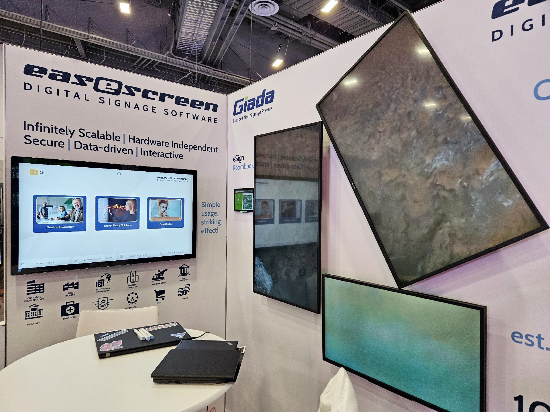 好博(中国)体育科技Giada作为全球数字标牌领域的领导品牌,产品应用范围涵盖全球大型连锁店,购物中心,学校,医疗机构,企业办公室等。本次展会,好博(中国)体育科技牵手合作伙伴easescreen,展示一系列创新数字标牌解决方案,带来强势产品及最新产品,现场收获超高人气。