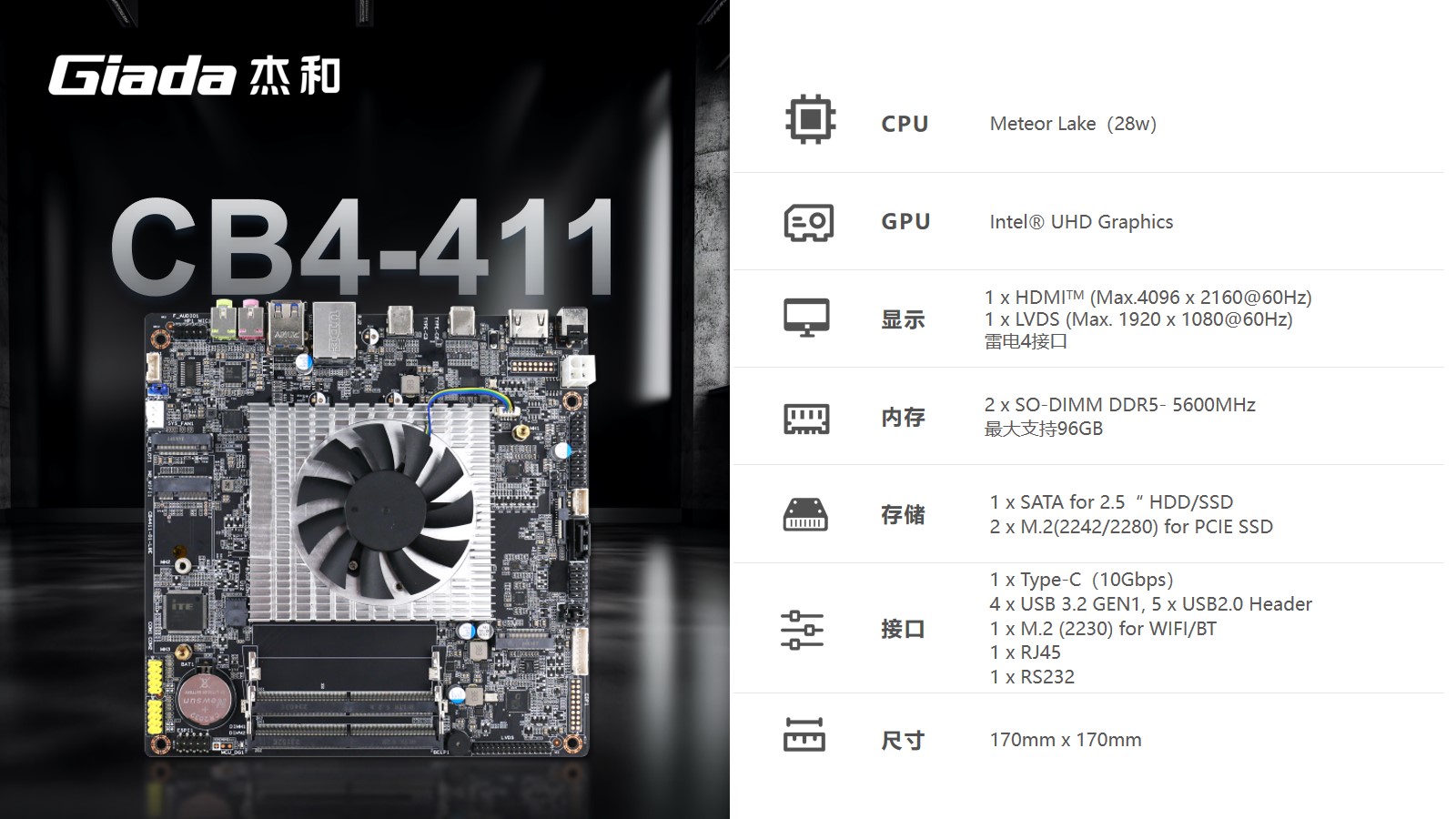 CB4-411采用 Intel® Meteor Lake 平台处理器,适配Ultra5、Ultra7、Ultra9H系列CPU,基础功耗为28 W,内置NPU神经处理单元,支持英特尔® 深度学习提升,拥有34TOPS算力,这是一款专为处理 AI 和机器学习任务而打造的处理器,利用CPU+GPU+NPU三个计算引擎协同运行,用户可以直接在电脑上处理AI工作。