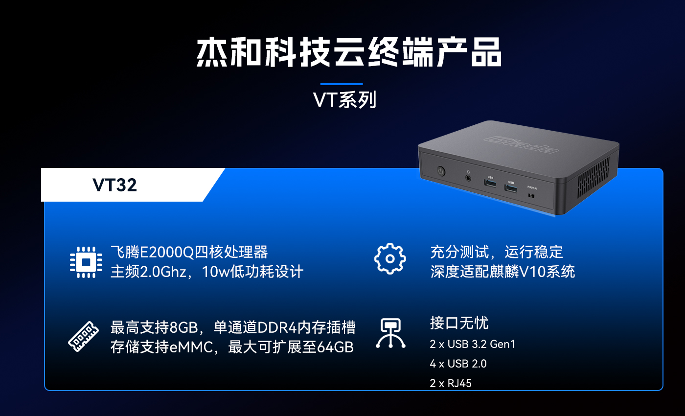 为响应信创趋势,好博(中国)体育科技推出了搭载国产芯片—飞腾E2000Q的云终端VT32,VT32与麒麟V10操作系统进行了深度适配,为用户打造出更加安全可信的解决方案。