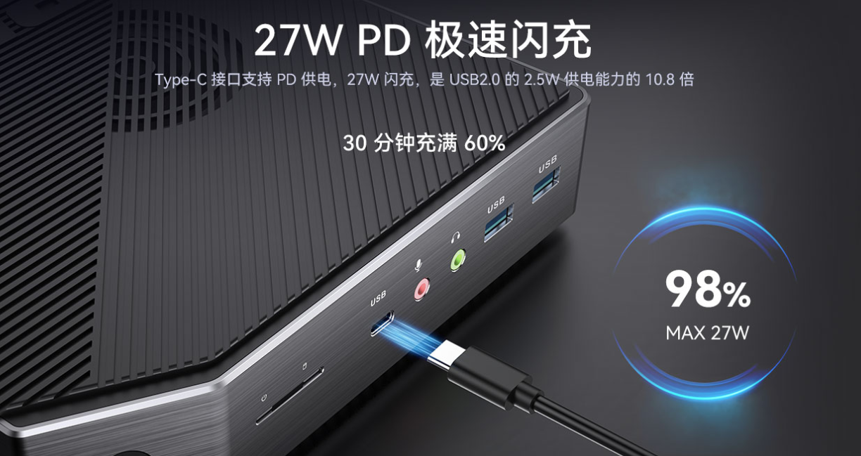 搭载Type-C接口,支持PD协议27W快充,30分钟可充满60%。