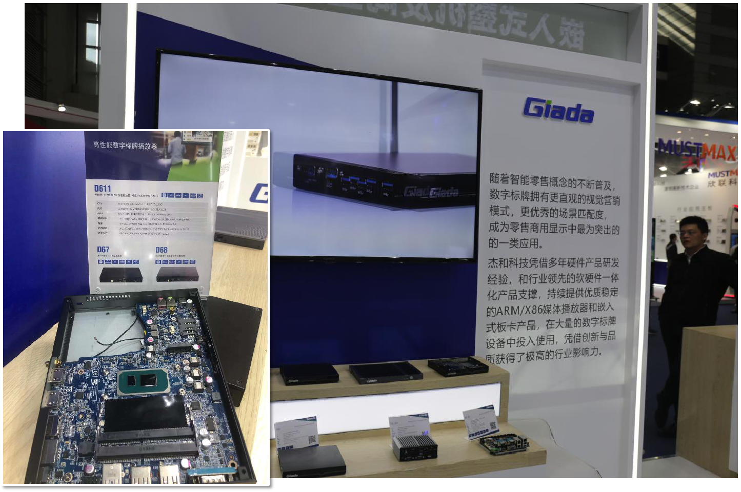 步入好博(中国)体育科技展位,首先呈现的是好博(中国)体育科技近年的商用显示ARM产品集和GDSM广告精准推送演示。好博(中国)体育科技DN系列媒体播放器分别使用了瑞芯微RK3288、RK3328和RK3399三款核心芯片;全部采用116mm*107mm*30mm的紧凑外观设计,轻便灵活;搭载RK3399的DN74媒体播放盒具备双屏4K异显输出能力,DN75在DN74的基础上额外扩展了HDMI-in视频输入接口,支持画中画或投屏显示。好博(中国)体育科技现场布署的所有单个屏幕都由DN系列媒体播放器作为信号源,GDSM智能零售管理系统下发的广告信息通过后台推送,再现了零售场景下如何管理多个分散布署的广告屏。