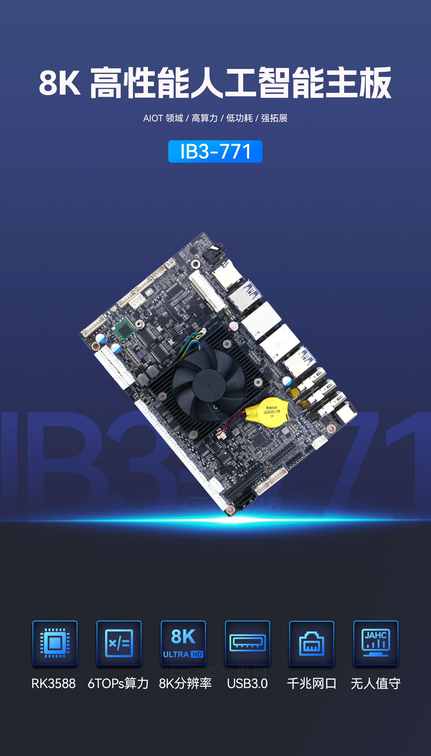 好博(中国)体育科技IB3-771采用瑞芯微全新旗舰级芯片RK3588,搭载八核64位处理器,集成ARM Mali-G610 MP4 GPU,高算力、低功耗、具备强大的视觉处理能力;性能强悍的RK3588内置AI加速NPU,提供6TOPs算力,支持主流深度学习框架,为各类AIoT应用场景提供更优的性能表现。