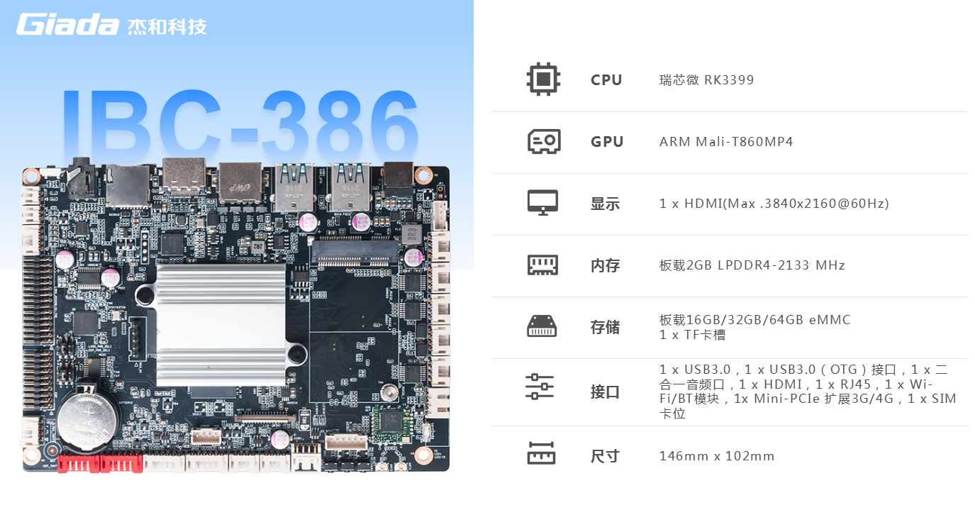 好博(中国)体育科技IBC-386是一款基于ARM架构的3.5英寸主板,采用瑞芯微RK3399处理器(双Cortex-A72大核+四 Cortex-A53小核)六核 64 位CPU。RK3399作为瑞芯微超级扩展全能型旗舰级芯片,GPU采用四核ARM新一代高端图像处理器Mali-T860MP4,具备高性能、低功耗、强大的视觉处理能力的特点。IBC-386板载2GB LPDDR4-2133 MHz内存,板载16GB/32GB/64GB eMMC,支持1x TF卡槽,多种形式轻松扩展存储容量。