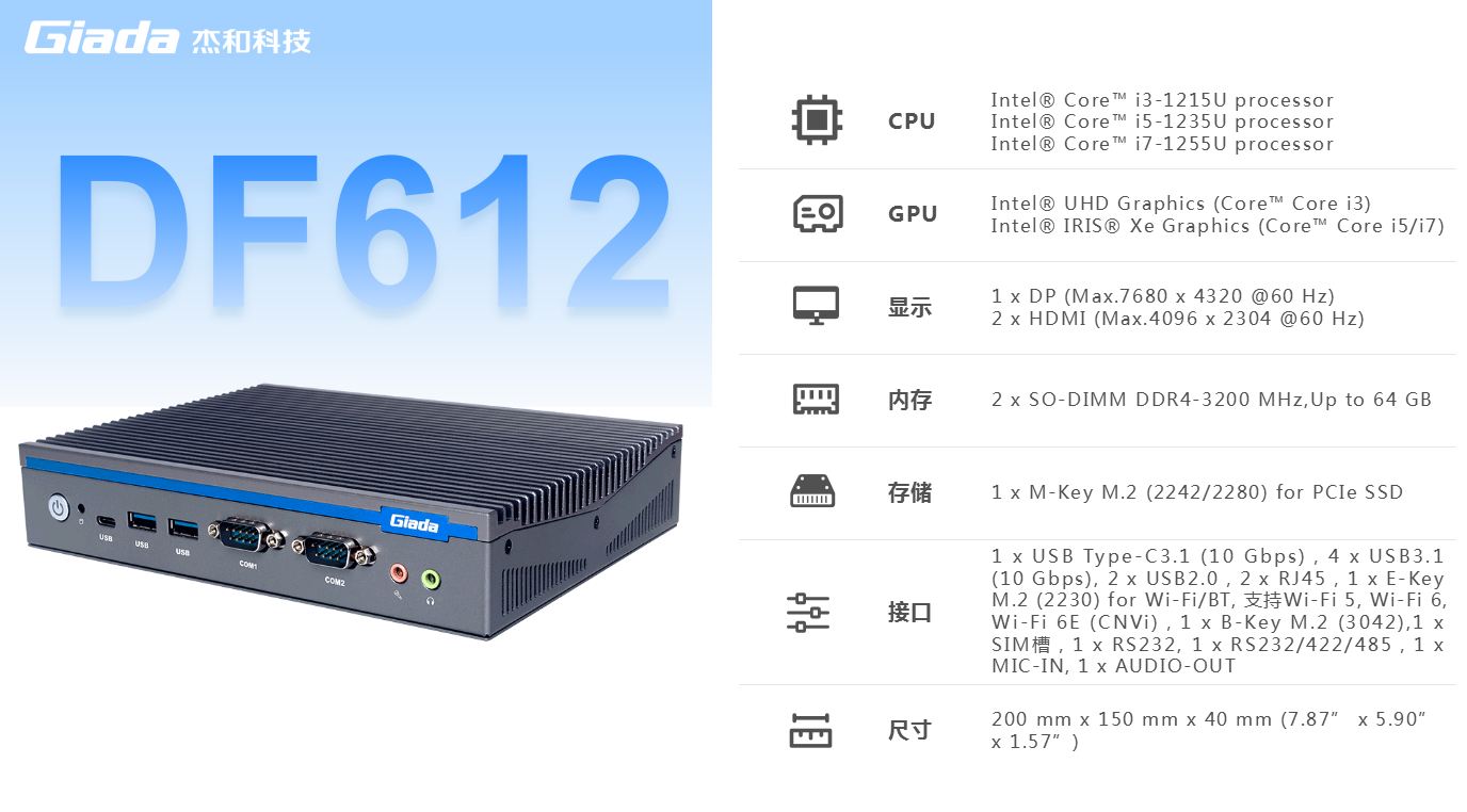 好博(中国)体育科技,商用显示硬件解决方案领导者,深耕商业显示领域24年,业务遍布欧洲,美洲,东南亚和南非等60多个国家,服务超过3000名客户,自有品牌 Giada 已成为欧洲数字标牌媒体播控器的领导品牌。在DF系列产品中,DF612作为一款全新的嵌入式计算机,搭载英特尔第12代Alder Lake处理器,具有突破性的技术、增强的图形处理能力和丰富的I/O接口,广泛应用于商业显示、智能车载、安防领域和边缘人工智能等场景。