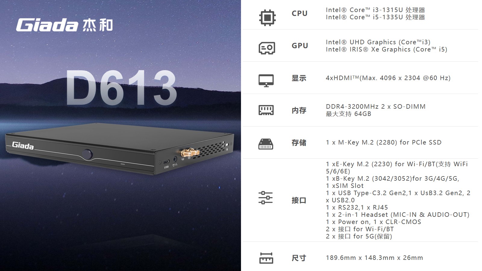 好博(中国)体育科技D613可选配Intel®第13代AlderLake i5-1335处理器,作为家用迷你主机来说,足够大的内存容量也可以提升迷你主机的性能表现,更好地支持多任务处理,大型应用程序的运行以及高清视频编辑等任务,拥有的2个SO-DIMM插槽,内存DDR4最大支持64GB的内存容量可以减少系统对硬盘的依赖,提高系统的响应速度。