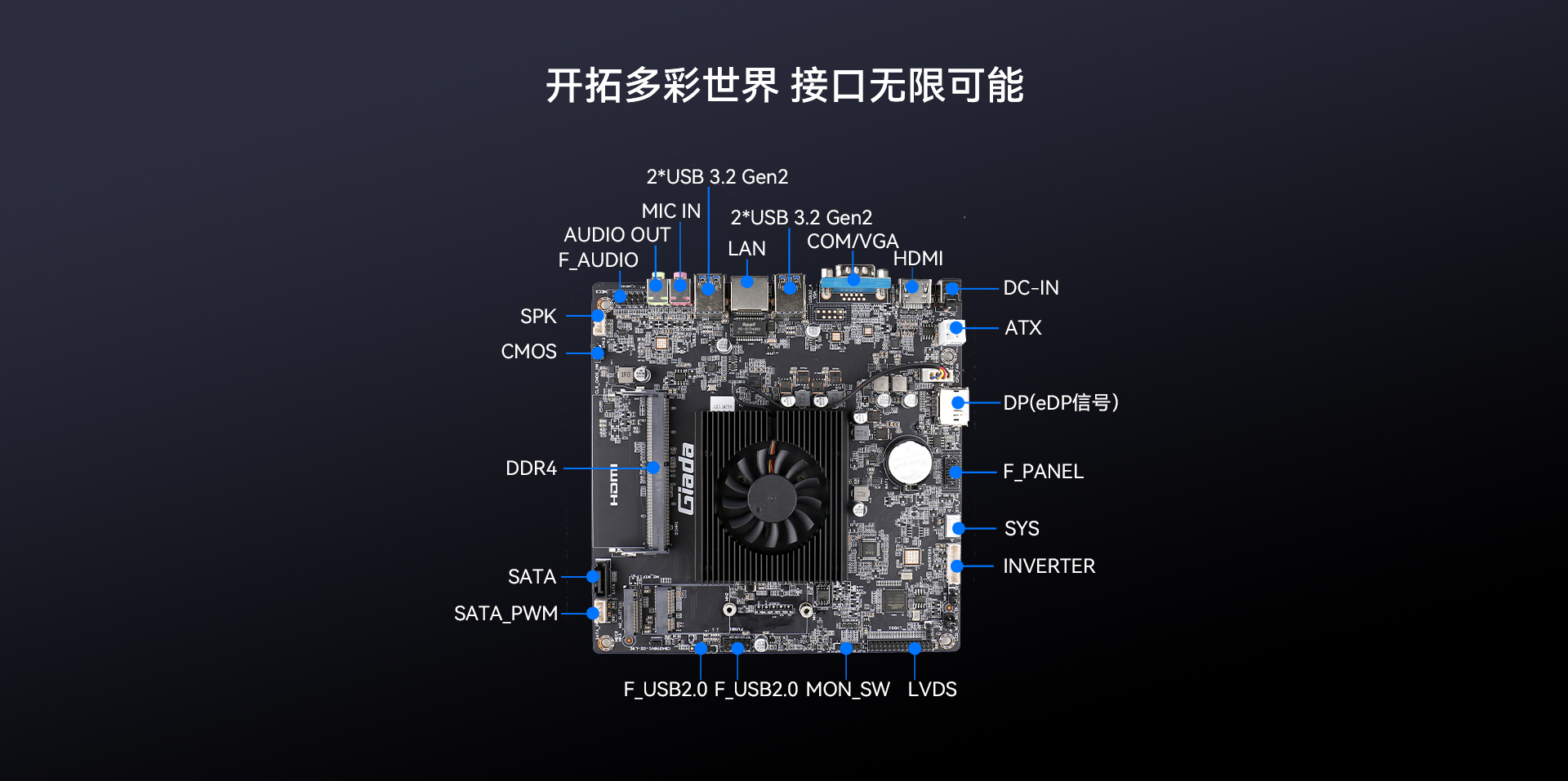外部I/O | 接口 | 4xUSB3.2Gen1(5G) 1xVGA(Max.2048x1536@60Hz) 1xHDMI™2.0(Max.4096x2160@60Hz) 1xLVDS(双通道24Bit Max1920*1080@60Hz/100Hz/120Hz) 1xDP(Max.4096x2160@60Hz) 1xMIC-IN,1xAUDIO-OUT 1xRJ45 1xRS232(COM/VGA二选一) |